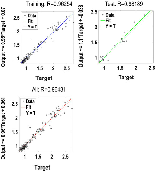 The NN was first trained with the input data in second category, including both the AE signals and the grinding parameters, i.e., cutting speed, feed rate, and depth of cut. Figure 6 shows the obtained results for the training of the NN to predict the surface roughness Ra. The following regression plots represent the network outputs with respect to targets for training, validation, and test sets. For an ideal fit, the data should fall along a 45-degree line, where the network outputs are equivalent to the targets. The fit was reasonably good for all data sets, with R (tangent of the slope degree of R) values in each case of 0.93 or above. Even though the Bayesian algorithm, in comparison to the Levenberg-Marquardt algorithm, needs more time for a training algorithm, the results of the Bayesian algorithm was considerably more impressive. The Bayesian backpropagation is slower because it uses the Gauss-Newton approximation to the Hessian matrix, which can be conveniently executed inside the framework of the Levenberg–Marquardt algorithm for building and training the network.