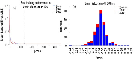 Figure 7b represents the error histogram with 20 bins (number of vertical bars), which is calculated as the difference between the targets of the NNs and the actual outputs.