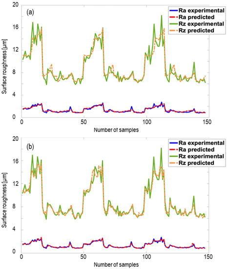 Testing the neural network for predicting the surface roughness (a) for the first input category (only grinding parameters); (b) for the second input category (both AE signals and grinding parameters).