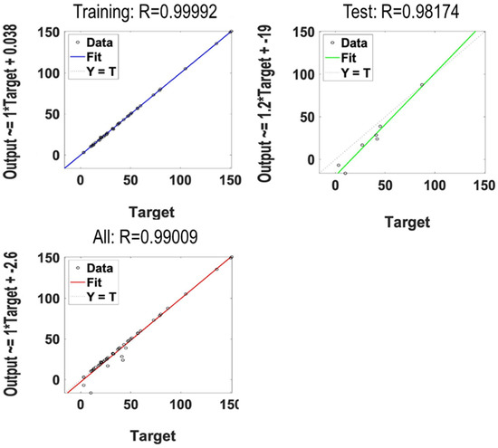 A NN was also trained for predicting the tangential and normal grinding forces with both input sets. The R values for predicting the tangential grinding forces are shown in Figure 9 for the second category. The R-value for all three-phase, test (0.9817), training (0.9999), and target (0.99) shown an accurate prediction for the grinding forces with the use of AE signals. The same NN was also trained with the first input set (only the grinding parameters). In contrast to the surface roughness, where the trained model with the first data set could predict the surface roughness with an acceptable error, the model was not able to predict the grinding forces with high accuracy (R = 0.76 for both normal and tangential forces).