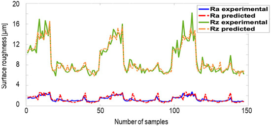 The error graph also shows that most of the errors in all stages are around the middle of the error histogram, which validates the training stage. The best train result for this network was achieved in the seventh attempt. In this try, the R of the training and testing are comparatively pleasant. In some cases, changing the number of hidden layers can improve the precision of the training phase, but as it was decided to keep all have the same method (NN) for the whole process, it was decided to have the same ANNs parameters for all the data. For the target R = 0.98189 and for the training R = 0.96254. In both cases, R values were acceptable. The best performance of the validation occurred in the epoch 72, with an MSE of 0.69851. The same NN was also trained with the first input category, including just the grinding parameters. The model could be trained with acceptable accuracy of R = 0.95; however, the testing error was relatively higher than the second category (R = 0.85 compared to R = 0.98 for category two in Figure 6). The results indicate that using cheap and easy AE signals as an input for the modeling of the surface roughness can increase the accuracy of the prediction. All predicted and experimental data for both categories are gathered in Figure 8 for the surface roughness of Ra and Rz. The fluctuations in the surface roughness values are because of different grinding parameter sets, which resulted in different surface roughness values. The result shows that the NN could precisely predict the surface roughness with the accuracy of 99 and 97 percent for Ra and Rz, respectively when using the date set two (Figure 8b), which is more accurate than the model trained with the input data in the category number one.