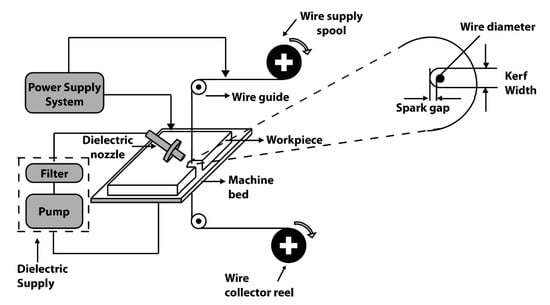 The experimental layout is shown in Figure 1. The experiments were conducted using a CNC Wire-EDM machine (Ecocut, Electronica, Pune, India). A cylindrical brass wire (Ø 250 µm) was used as a wire electrode with negative polarity and deionized water was used as the dielectric fluid. Both electrodes were kept immersed in dielectric without any external flushing while performing experiments.