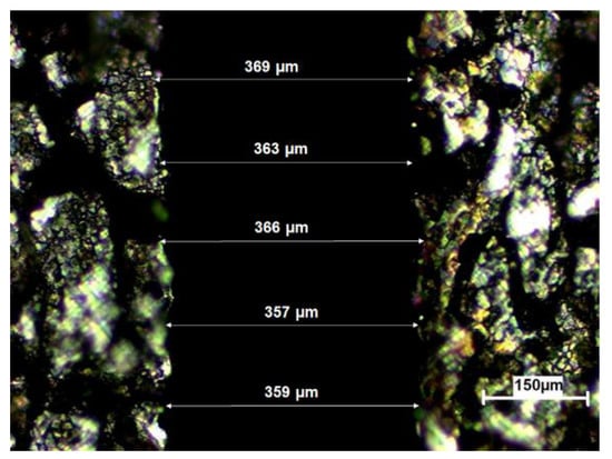The kerf width (Kf), surface roughness (Ra), and material removal rate (MRR) were chosen as the response variables. An optical microscope (AxioCam AX10, Zeiss, Germany) was used for the measurement of kerf width at five different locations along the length of the microchannel (as shown in Figure 2) and then the average of these measurements was considered as Kf of the microchannel. Ra was measured at three different locations on the same surface using a surface roughness tester (SJ210, Mitutoyo, Japan) which has a conformance standard of ISO 1997 and the corresponding mean value was considered as the net Ra value. The cut-off length (λc) of 0.8 mm and the number of sampling (λ) of five (traverse length is 0.8 × 5 = 4 mm) were used in the measurements. Furthermore, the surface quality was investigated by analysing the surface morphology with the help of field emission electron scanning microscopic (FESEM) images taken by Nova NanoSEM 450® (FEI, Hillsboro, OR, USA).