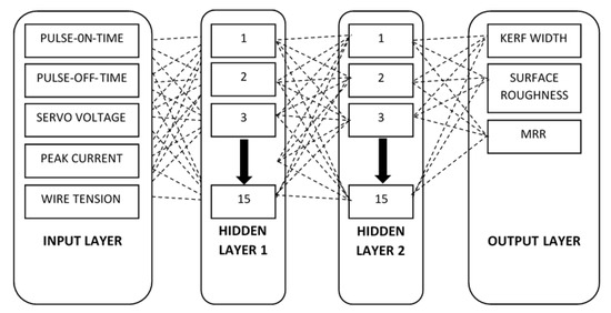 ANN is an intelligent computational system able to fit complex functions. It was successfully used for solving numerous problems in various fields such as diagnosing of faults, identification of the process, property estimation, smoothing of data, and error filtering, designing and development of a product, optimization of processes, and estimation of activity coefficients [34,35]. The neural network is based on the idea of biological neural networks, and can be defined as a vastly parallel distributed processing technique. It is formed by neurons that have the capability to acquire, to learn, and to adapt to the information, in order to make it available for future use [36,37]. Thus, by taking the computational capability of a multi-layered neural network into account, we adopted it for the modelling of the WEDM process to predict the response variables Kf, Ra, and MRR involved in the machining of Inconel 718.