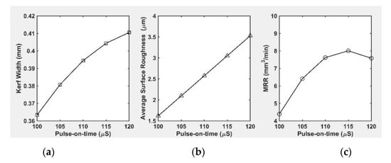 Effects of pulse-on-time (TON) on (a) kerf width, (b) surface roughness and (c) MRR.