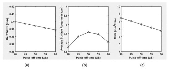 Effects of pulse-off-time (TOFF) on (a) kerf width, (b) surface roughness and (c) MRR.