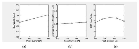 Effects of peak current (IP) on (a) kerf width, (b) surface roughness, and (c) MRR.