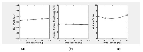 Figure 8a shows a graph plotted between WT and Kf. It was found that wire tension has a negligible impact on kerf width. Figure 8b shows that the effect of wire tension on surface quality is even less marked than the effect on kerf width. However, increasing wire tension allows mechanical vibrations to be reduced and thus wire deflection from its straight path to be minimized. Hence, the wire electrode keeps closer to its nominal (i.e., mean) position throughout the machining process. This contributes to enhance the MRR parameter (see Figure 8c).