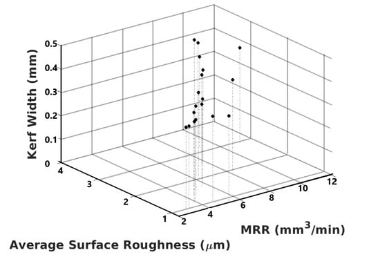 The selected NSGA-II variables were identified on the basis of the literature and the characteristics of the current optimization problem to obtain optimal solutions with low computational effort: Maximum Number of Generations = 100, Total Population Size = 50, Mutation Probability = 0.25, Crossover Probability = 0.8. To determine the Total Population Size, sufficient optimization runs were conducted. After analyzing the results, it is found that the value of the objective functions attains its maximum value for a total population size of 50. Furthermore, it was observed that there was no appreciable change in the objective function value with further increase in total population size. Therefore, we selected a total population size of 50 for this research work. Crossover Probability for this research work is taken as 0.8, as it was observed that faster initial convergence was obtained for the value of 0.8 after testing eight different values varying from 0.1 to 0.9. The Mutation Probability needs to be kept low in order to avoid random searches, but too low a mutation probability results in a local minimum/maximum. Therefore, a mutation probability of 0.25 was selected in this study so that the genetic algorithm avoids stopping at a local minimum/maximum. Figure 10 shows the Pareto front of the results in the exploration space for the optimization results. The NSGA-II yielded 18 optimal solutions which are listed in Table 10. Furthermore, it was also observed that there was a trade-off between MRR, kerf width, and surface roughness. i.e., no solution is better than any other solution and the decision maker will have to choose from the optimum results on the basis of particular requirements.