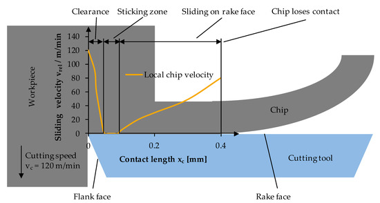 Bonnet described the different friction parts on the rake face in the machining of steel that are shown in Figure 1 [2]. Directly behind the cutting edge, the chip velocity rapidly shrinks to zero. For a certain contact length, the chip material has a sliding velocity of zero, which starts to increase for the rest of the tool–chip interface, before the chip loses contact to the tool. Subsequently, a constant friction coefficient over the whole tool–chip contact length, as used for many simulations, cannot be considered practical.