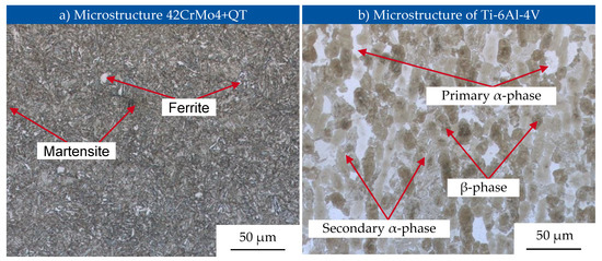 Micrographs of 42CrMo4+QT (a) and Ti-6Al-4V (b).