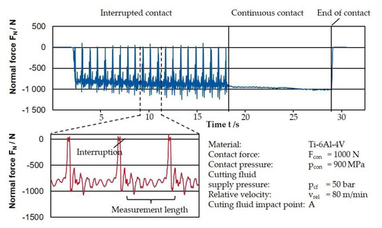The measured force signals were transferred into the tool coordinate system in order to evaluate the friction and frictional normal force. An exemplary signal of the normal force for the two investigated friction conditions (continuous and interrupted contact) is shown in Figure 4. For the signal of the interrupted contact, the alternating contact can clearly be seen. To examine the friction coefficient from the measured signals, the frequency of engagement has been filtered out and the average has been calculated from the remaining signal. Thereby, the friction coefficient has been calculated separately for the two contact conditions.