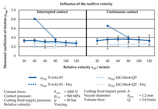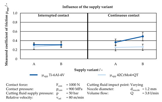 The CF in dependency of the cutting fluid impact point are shown in Figure 11. While the impact point has no considerable influence on the CF for the interrupted contact, the influence on the CF for Ti-6Al-4V under continuous contact conditions is distinct. The CF increased from µapp = 0.39 by about 26% to µapp = 0.49. The vast influence of the cutting fluid impact point on the CF when using titanium indicates that the cutting fluid is not able to penetrate the contact zone or is drawn away before the agents can act in the contact zone. According to the previous examinations, the cutting fluid has nearly no impact on the friction with 42CrMo4+QT as workpiece material. Therefore, it can be said that for the CF of 42CrMo4+QT it is of subordinate importance if and where the cutting fluid is applied, because of the self-lubrication effect of the material. However, the cutting fluid impact point has a vast influence on the CF when machining titanium. In the interrupted contact, the cutting fluid is able to wet the contact zone, because of the interruption by the grooves in the workpiece. On the other hand, in continuous contact, the friction rapidly increases once the cutting fluid is drawn away from the contact zone. As a result, the CF in continuous conditions correspondents approximately to the CF for the dry experiments.