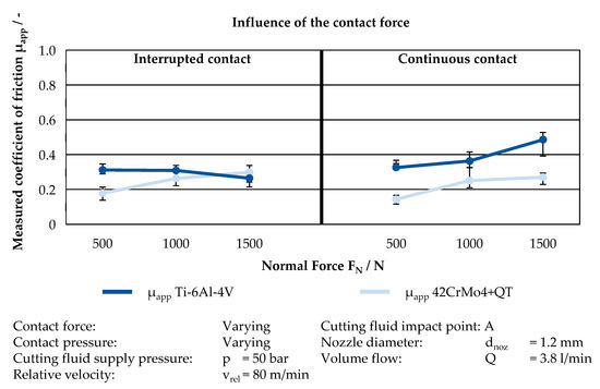 To investigate the influence of the contact pressure between the tool and workpiece on the friction, the normal force has been varied in three stages from 500 N to 1500 N. The feed has been increased until the predefined contact force was reached. The results of the conducted experiments are shown for both investigated alloys in Figure 6. For Ti-6Al-4V in the interrupted contact, a slight decrease can be observed with increasing normal force. It is expected that the thermal softening effect of the workpiece material due to the higher plastic deformation causes the decreasing trend of the CF. However, for the interrupted contact, the experimental results show that a sufficient wetting of the surface due to the grooves is still given and that the CF is, therefore, not affected to a large extent. For the 42CrMo4, the influence of the increased normal force is oppositional to the Ti-6Al-4V alloy. When increasing the normal force, an increase of the CF can be observed for 42CrMo4+QT. This trend is deducted to the low frictional effect of the cutting fluid for 42CrMo4+QT, which has been observed for the previous experiments as well. Higher normal forces result in this case in higher normal pressures, which cannot be compensated by the cutting fluid.