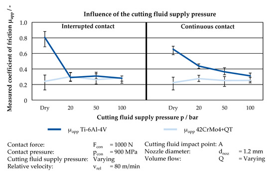 The cutting fluid supply pressure was set directly at the high-pressure pump. Three different pressures of p = 20 bar, p = 50 bar, and p = 100 bar were used. Figure 7 shows the influence of the cutting fluid supply pressure on the coefficient of friction.