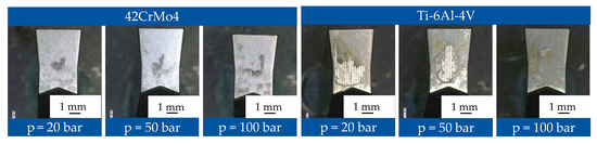 In terms of wear of the cutting tool inserts, an increasing supply pressure had a highly wear reducing effect in the experiments with the workpiece material Ti-6Al-4V, Figure 8. Opposed to this, the effect of the cutting fluid supply pressure on tool wear with the workpiece material 42CrMo4+QT was negligible. This supports the hypothesis that Ti-6Al-4V demands high lubrication properties on the cutting fluid supply strategy, whereas 42CrMo4+QT has sufficient self-lubrication properties under the examined parameter range.