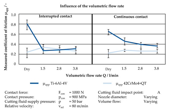 The measured data from the friction experiments are shown in Figure 9. Analogous to the results of the influence of the supply pressure, an increase of the volumetric flow rate did not lead to a noticeable difference in the CF for both materials during the interrupted contact. In the continuous contact, the CF decreased with an increasing volumetric flow rate when using titanium as workpiece material. The CF decreased from about µapp = 0.46 (Q = 1.5 L/min) to µapp = 0.36 (Q = 3.8 L/min), which equals a decrease of approximately 22%.