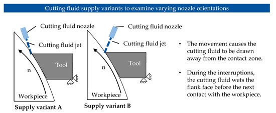 The two investigated cutting fluid impact points, as a result of a varying impact angle, are illustrated in Figure 10. The first supply impact point (A) correspondents to the supply of cutting fluid into the contact zone between chip and tool. The impact point (B) is set directly in front of the flank face to show the effect when the cutting fluid impacts in front of the wedge between tool and emerging chip, which may lead to atomization and a lack of penetrability into the contact zone.
