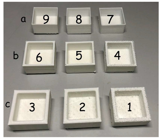 Figure 2. The nine printed items. From left to right: (a) First row (1 mm wall): Models 9 (230 °C), 8 (220 °C), and 7 (210 °C), (b) Second row (2 mm wall): Models 6 (230 °C), 5 (220 °C), and 4 (210 °C), (c) Third row (3 mm wall): Models 3 (230 °C), 2 (220 °C), and 1 (210 °C).