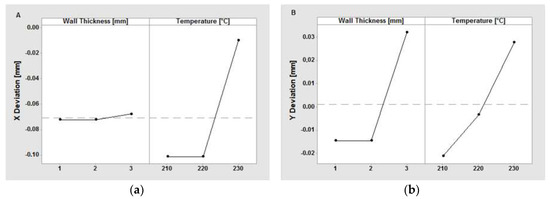 According to the ANOM calculations (Table 6 and Figure 4), the level parameter’s combination that minimizes the absolute value of the X and Y deviation is, correspondingly: wall thickness: 3 mm, extraction temperature: 230 °C; wall thickness: 1–2 mm, extraction temperature: 220 °C.