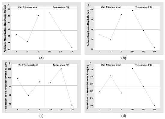 In the case of surface roughness parameters, the ANOM results showed that the factor levels which minimize them are: wall thickness: 2 mm, extraction temperature: 230 °C for Ra; wall thickness: 2 mm, extraction temperature: 230 °C for Rz; wall thickness: 2 mm, extraction temperature: 230 °C for Rt; wall thickness: 3 mm, extraction temperature: 230 °C for Rsm (see Table 7 and Figure 5).
