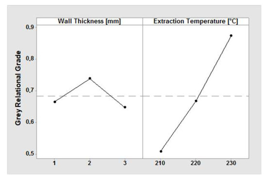 Analysis of means along with analysis of variance have been conducted for the derived grey relational grade. The ANOM results (see Table 13) revealed that extraction temperature is more influential than wall thickness. The optimal parameter levels are those that have the highest grey relational grade value as it is shown in the plot of means (Figure 6). These levels are: (a) wall thickness: 2 mm, (b) extraction temperature: 230 °C.