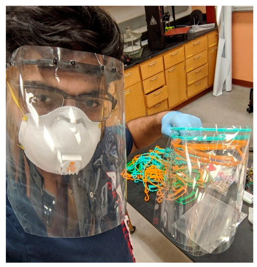 Several 3-D printable designs for face shields were created during the COVID-19 pandemic (e.g., Figure 2) [158,159,160]. They involve a printed component, a clear plastic sheet, and in some cases, bands. Other designs can simply be cut from the plastic sheets themselves and were released on Creative Commons licenses [161]. Such PPE is widely used throughout the world [162,163]. The entire device could be fabricated using open source tools and could meet its function from plastic waste using readily available RepRap-class 3-D printers and recyclebots.