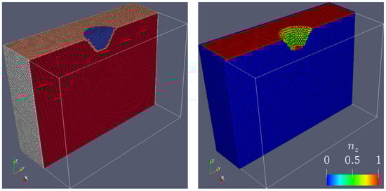 Illustration of how the proposed boundary treatment works. Left: the particle label is color coded, where red shows the active particles, white the wall boundaries, orange the laser surface, and blue the molten particles. Boundary conditions are applied to white and orange particles, while blue molten particles are effectively deleted from the simulation. Right: the color indicates the z-component of the unit normal vector pointing outward from the laser-irradiated surface, i.e., computed from Equation (22). The laser heat source expressed in Equation (2) is multiplied by for those particles exposed to the beam.