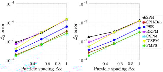 The numerical results were compared with the exact solution at , and the norm of the error is reported. The convergence plots shown in Figure 4 permit several interesting observations. Firstly, it can be seen that almost all methods converged with a second-order slope in the regular spacing (left graph in Figure 4). Secondly, CSPM and ICSPM delivered identical results for the uniform case. This was quite unsurprising because the main advantage of ICSPM over CSPM is its ability to provide higher-order consistency by improving the boundary deficiency, but the boundary effect in this example was negligible. When particles were not uniformly spaced, however, a marginal difference between the CSPM and ICSPM results was noticed. Thirdly, FMFS demonstrated the lowest error and outperformed the other Laplacian models in almost all cases. This was due to the higher order terms included in its truncation error. A particularly interesting conclusion from this investigation was the nearly identical behavior of SPH Brookshaw (the red graphs in Figure 4) and FMFS in discretizing the Laplacian term for uniform cases. The reason lied in the derivation process of FMFS, which originated from a Brookshaw approximation. Please consider [35] for more details in this regard.