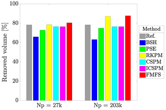 After having completed the parametric study, the optimum setup for each method could be configured. In Figure 6, the removed volume predicted by this 3D solver is compared to the corresponding value taken from a 2D meshless model developed by Abidou et al. [13]. The bar-chart shows that the highest volumes were computed by FMFS on account of its higher order terms involving a larger number of particles for each interpolation.