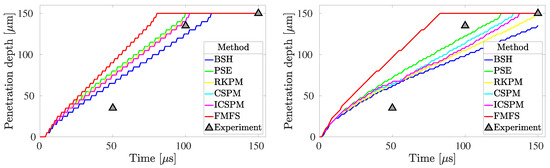 Due to the sufficient simplifications considered in this test model, any validation or comparison versus experimental measurements would be questionable at best. Nevertheless, it was still worthwhile to include a demonstration of the present result against other references. Simulated penetration depths computed by this code are plotted in Figure 7 for all six methods at two different resolutions. The numerical values and overall trend were found acceptable compared to the experimental data provided by [10] and the numerical solutions of [13]. It is important to mention that the numerical simulation presented by [13] was also performed by taking a set of assumptions similar to what was outlined in this paper.