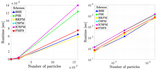 As far as the computational cost was concerned, attention must be paid when comparing the runtime of different schemes in purely thermal simulations. In all corrective methods (RKPM, CSPM, ICSPM, and FMFS), a significant proportion of the computational cost was attributed to the computation of their correction matrices. However, the evaluation of these matrices here was not updated within the main time loop, and a remarkable amount of computational time could be saved because the particle position remained unchanged during a purely thermal simulation. Interestingly though, the PSE scheme was indifferent to the movement of particles. It considered an exponential kernel according to Equation (10), no matter if the particle position had been changed or not. Therefore, any conclusive judgment about the computational performance of these six methods was reckoned to be inaccurate and was probably unfair.