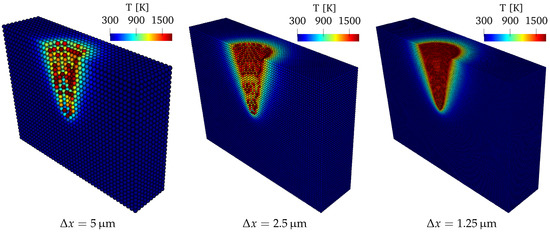The parameter in these four tables denotes the characteristic distance between particles in a uniform domain. Furthermore, the appearance of “—” corresponds to a scenario where the numerical result was unreliable or invalid. The source of these errors may stem from different issues such as the surface detection algorithm, boundary conditions, insufficient number of neighbor particles, and inconsistent kernels. An elaboration of how to resolve such issues is irrelevant to the scope of this paper and thus not provided. For further discussions, the readers are referred to textbooks and review articles such as [40,41]. Note that at surface particles was always computed by PSE even if other corrective schemes (RKPM, CSPM, ICSPM, or FMFS) were employed in the code. This new workaround ensured the stability of the solution without requiring exterior dummy particles for an invertible correction matrix where boundaries were not well defined geometrically (e.g., the laser-irradiated surface inside the popped hole).