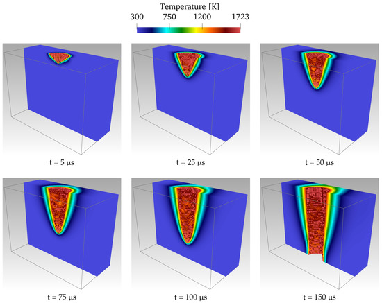 Lastly, images of the temperature distribution are provided in high resolution to gain more insights into the process. Figure 11 contains six frames of the simulation taken at six consecutive time instants, where PSE was employed for the discretization of the Laplacian operator. As a verification that our results were correct, the pictures in Figure 11 could be compared with those generated by [10,13] for a very similar case. These snapshots also served to represent how the laser-induced heat was transferred into the metallic workpiece, leading to the formation of the drilled hole. A summary of this scenario, which was captured by the present implementation rather nicely, follows. Initially, top surface particles absorbed the thermal energy provided by the laser beam. Due to the heat conduction, material particles were heated up until they reached the melting point and consequently become inactive in the simulation. These molten particles (invisible in Figure 11 because they were inactive in the model) were removed from the popped hole, and the laser beam was applied onto a newly generated surface (i.e., the orange particles in Figure 2). Therefore, the evolutionary boundary conditions during this procedure were effectively handled; the drilled hole was progressively developed; and the drilling penetration was obtained.