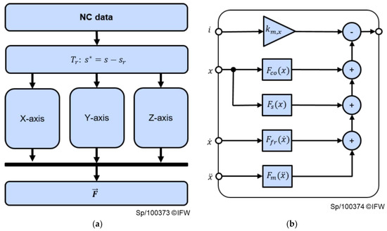 An established method to reconstruct process forces is the model-based compensation of nonlinear forces acting on the drives, described in detail by Albrecht [17]. According to this, the forces acting on the electrical motor can be summarized to Equation (1), depending on drive current , axis position and its derivatives.