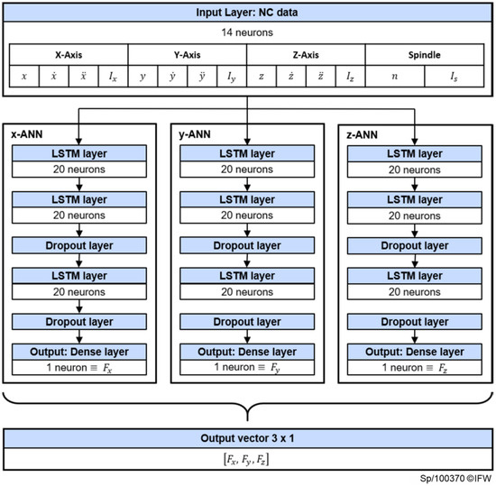 The developed network is presented in Figure 3. Its input neurons correspond to the control data of the Sinumerik 840D sl. In particular, these are the axis positions, velocities, accelerations, and motor currents of the X-, Y-, and Z-axis as well as the spindle speed and the motor current of the spindle. The input layer is connected to a layer consisting of 20 LSTM cells followed by two more LSTM layers by the same size. Finally, the output layer is formed by a single neuron, representing one of the force components in the X-, Y-, and Z-direction. Consequently, each force component is decoupled with its own sub-ANN. The design of the neural network results in an iterative process performed on a subset of the training data. Based on this subset it was found that three separate LSTMs converged faster than a single network reconstructing all three force components at once. To avoid overfitting, dropout is used during the training of the network [23].