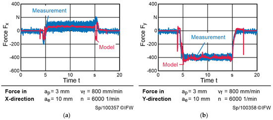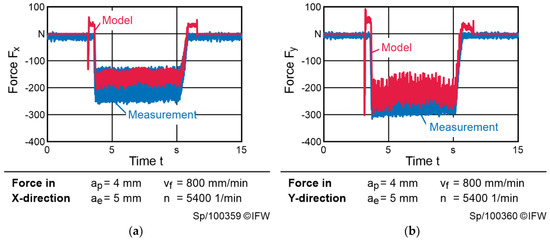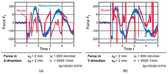 Comparison between measured process forces and the model-based approach during milling of a diagonal groove: (a) force acting in X-direction (root mean square error (RMSE) = 36.22 N); (b) force acting in Y-direction (RMSE = 28.25 N).