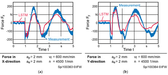 Comparison between measured process forces and the result of the LSTM during milling of a circular pocket: (a) force acting in X-direction; (b) force acting in Y-direction.