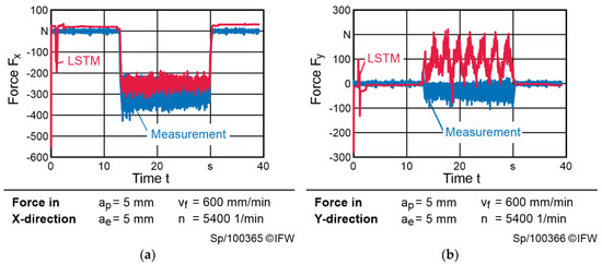 Comparison between measured process forces and the result of the LSTM during side milling in negative X-direction: (a) force acting in X-direction; (b) force acting in Y-direction.
