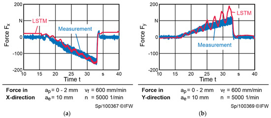 Comparison between measured process forces and the result of the LSTM during ramp milling in negative Y-direction and positive Z-direction: (a) force acting in X-direction; (b) force acting in Y-direction.