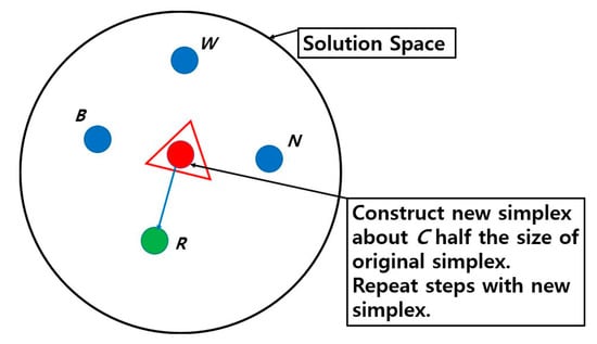 The Nelder–Mead simplex method [17] can be used to minimize a mathematical function by evaluating the result. This method is especially employed for non-linear problems for which the derivatives may not be known. The Nelder–Mead simplex method usually has effective and computational compact procedures. In n + 1 dimensional space, when x1, …, xn, xn+1 are given, this space can be defined “simplex”, where f(xi) is a function value at xi. When i and j are different, each function value can be written by xi and xj, and the centroid point between these values can be defined by C. To find the optimum value when variables change, there are three operations. Reflection, contraction, and expansion were used to find an optimum value [16].