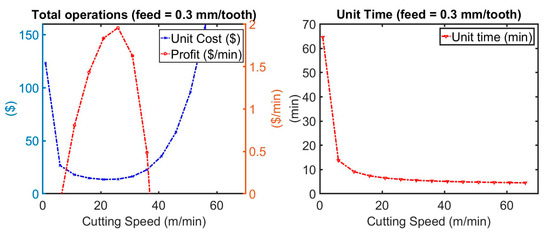 In Equation (37), Sp, Tu, and Cu refer to the sale price of a component, unit time, and unit cost, respectively. If feed and the cutting speed increase, unit time decreases, due to increasing the metal removal rate. However, that results in increasing unit costs. Therefore, great balance between the cutting speed and feed is required within constraints, such as maximum machine power, surface finish requirements, and maximum cutting forces. Equation (38) was used as an objective function in this work. Equations (29) and (36) are plugged into Equation (37).