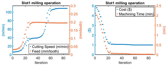Equation (27) is the unit cost equation for a machining process that only involves a single tool, and it is represented as a function of machining parameters, such as the cutting speed and feed. As regards multi-tool operations, tool changing time should be considered as multi-machining operations are needed. Equation (27) can be transformed to the i-th term up to m operations, where ttci is the tool changing time, and Cti is the cost of each cutting tool.