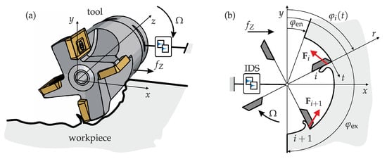 where and are, respectively, the edge and cutting coefficients resulting from the linear regression of the experimentally measured mean cutting forces [26]. is the regenerative delay, which equals the tooth passing period in this simple case. The momentary chip thickness is defined as