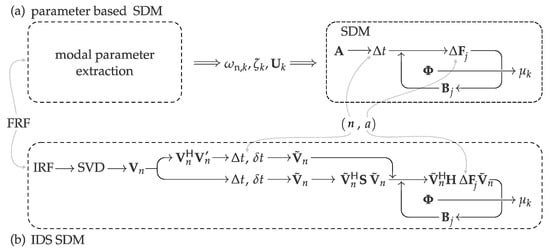 The flowcharts show the comparison between modal parameter-based semidiscretization method (SDM) (a) and the Impulse Dynamic Subspace (IDS) SDM description (b). Prior to the conventional modal description, modal parameter extraction is needed, while the IDS SDM description is initiated, in theory, using a known IRF.