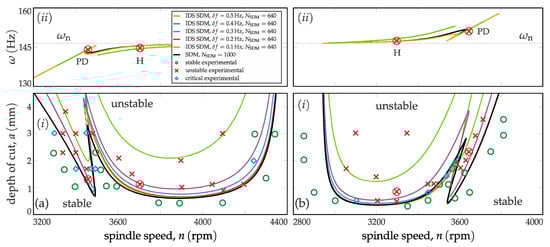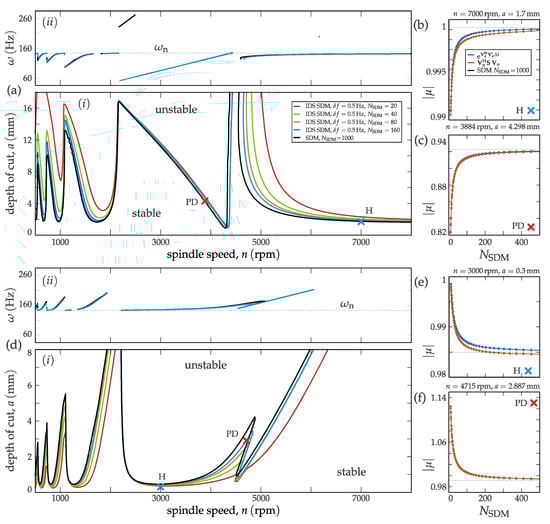 As in the conventional SDM, the accuracy of the IDS SDM decreases for larger time delays, that is, for lower spindle speeds if . This phenomenon is apparent in all SLDs in Figure 3a,d(i)). The dominant vibration frequencies can be calculated using the critical characteristic multiplier and its corresponding eigenvector [32], which approaches the exact (SDM, ) case quite well (see Figure 3a,d(ii)). In terms of Hopf-related stability loss (H), Figure 3a,d(ii)) shows the well-known behavior [33] when milling process with negative directional factor oscillates with lower, while milling process with positive directional factor oscillates with higher vibration frequencies than the corresponding natural frequency . In the case of period-doubling (PD)-related instability, the vibration frequencies in (see Figure 3a,d(ii)) are located on a straight line (m is odd), which can be used for identifying PD related curves in the SLDs (see Figure 3(i)). The converged solution shows high discrepancy for the DM case in Figure 3a(ii)) in the range , which is due to the relocation of dominance between different modulations of . In general, the convergence is better for period-doubling (flip) type (PD) of instabilities because these are more strongly related to the well-represented time-periodic nature of the milling process than to its delayed essence.