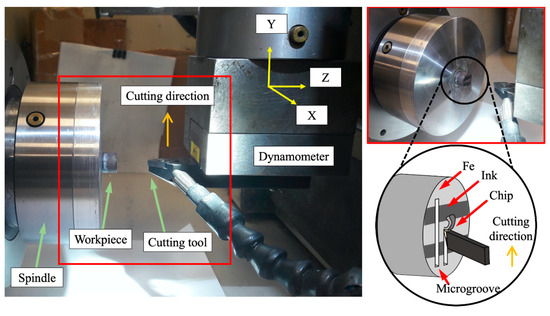 A series of experiments was conducted on low-carbon magnetic iron (ASTM-A848-01) procured from Kim Ann Engineering Pte. Ltd., Singapore, using an ULG-100 ultraprecision machining center manufactured by Toshiba Machine Co. Ltd., Shizuoka, Japan. The material composition is listed in Table 2. The influence of SAM on the work material was first verified through orthogonal microcutting tests, followed by the evaluation of diamond tool wear in diamond turning experiments. To ensure the flatness of the 12.7 mm-diameter sample surfaces before the start of each test phase, face trimming was performed using a 0.8 mm nose radius cubic boron nitride (CBN) cutting tool with a 0° rake angle and 7° clearance angle. The trimming feed was set at 15 µm/rev with a 2 µm nominal depth of cut. To verify the mechanochemical effect, two stripes (2 mm wide) stripes of Dykem High Purity marker ink (44404) were applied across the trimmed surface along the X direction. Subsequently, orthogonal microgrooves were conducted in perpendicular to the stripes at a constant cutting speed and depth of 50 mm/min and 12 µm as shown in Figure 1. Machining forces were measured using a Kistler 9256C1 dynamometer and type 5051A amplifiers with a sampling rate of 10 kHz. The cutting, thrust and lateral forces were oriented along the Y, Z, and X directions shown in Figure 1. Cutting chips were studied using a Jeol JSM-5500 scanning electron microscopy (SEM). The manifestation of the mechanochemical effect during orthogonal microcutting will be determined based on the reduction in cutting forces and the changes in chip morphology.
