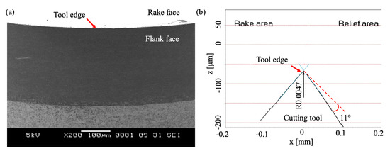 The simulation was performed using commercially acquired software ABAQUS/Explicit with the in-built Johnson–Cook (J–C) material model [48]. The J–C constitutive model captures the material viscoplasticity during the deformation of metals under large strain, high strain rates and the influence of thermal softening. A 0° rake-angled cutting tool with an edge radius of 2 μm was modeled as a rigid surface to assume the strong mechanical properties of diamond. The cutting speed was set at 50 mm/min and the cutting depths were modeled as 10 μm. The two-dimensional workpiece was built with 10,253 CPE4R elements with an average mesh size of 0.5 μm. Specific cutting forces were determined by the cutting force per unit width of material removed.