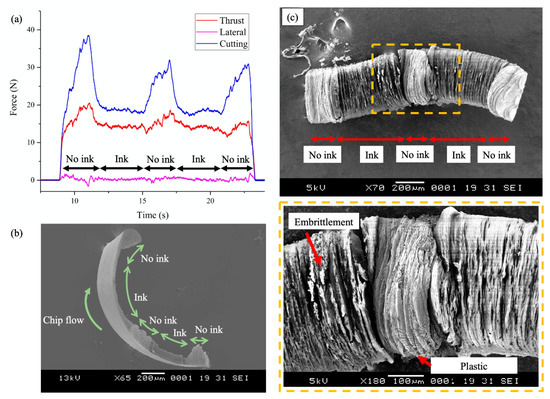 The phenomenon to temporarily alter the material properties has been realized through the chemical interaction (chemisorption) of a surfactant on a metal surface. The adsorption of surface-active media (SAM) was believed to reduce the surface energy of a material, which resulted in the embrittlement or enhanced plasticity in a solid [24]. This effect, named after its discoverer P.A. Rehbinder [25] as the “Rehbinder effect”, inadvertently influences the machining process by altering the plastic deformation during chip formation. Chaudhari et al. [26] applied marker ink in the microcutting process of copper and aluminum and saw a reduction in machining forces by 50% and 30%, respectively. Together with the reduction in cutting forces, thinner chips with reduced plastic deformation were observed when machining the surfactant-applied metal surfaces. Udupa et al. [27] also witnessed the transition from sinuous chip flow to a segmentation type with fractures on the free surface during the orthogonal mesoscale cutting of copper with glue as the SAM.