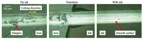 Although not commonly reported, the mechanochemical effect also improves the machined surface quality [23]. A sharp distinction in machined surface topography can be observed between that produced with and without SAM, as shown in Figure 4. Unique surface defects in the form of dimples are prominent in the regions without ink, which is similar to the observations in the micromachining of AISI 1045 steel [34]. In microcutting, considerations for material deformation characteristics of individual grains must be adopted, such that plastic deformation occurs by shearing along the slip planes of the grain crystallographic orientation. The randomly oriented grains then result in changes to the material removal process such as the deformation features in the chips [35] and the machined surface [36]. The misalignment of shearing forces for favourable slip deformation would result in machined surface defects [36], taking the form of the dimples observed in Figure 4. On the contrary, smooth defect-free machined surfaces can be produced with the application of ink, which suggests that the shearing action occurs with ease along the slip system under the mechanochemical effect. It is good to note that the transition to a smoother machined surface is not dependent on the coating thickness, which rules out the mechanical implications of the ink as a solidified coating that was observed by Lee et al. [37] during the micromachining of brittle materials. The observations of the characteristic features of the Rehbinder effect in machining [26,28] verify the effectiveness of the mechanochemical effect on the iron workpiece and serve as the fundamental mechanism to explain the differences in diamond tool wear.